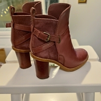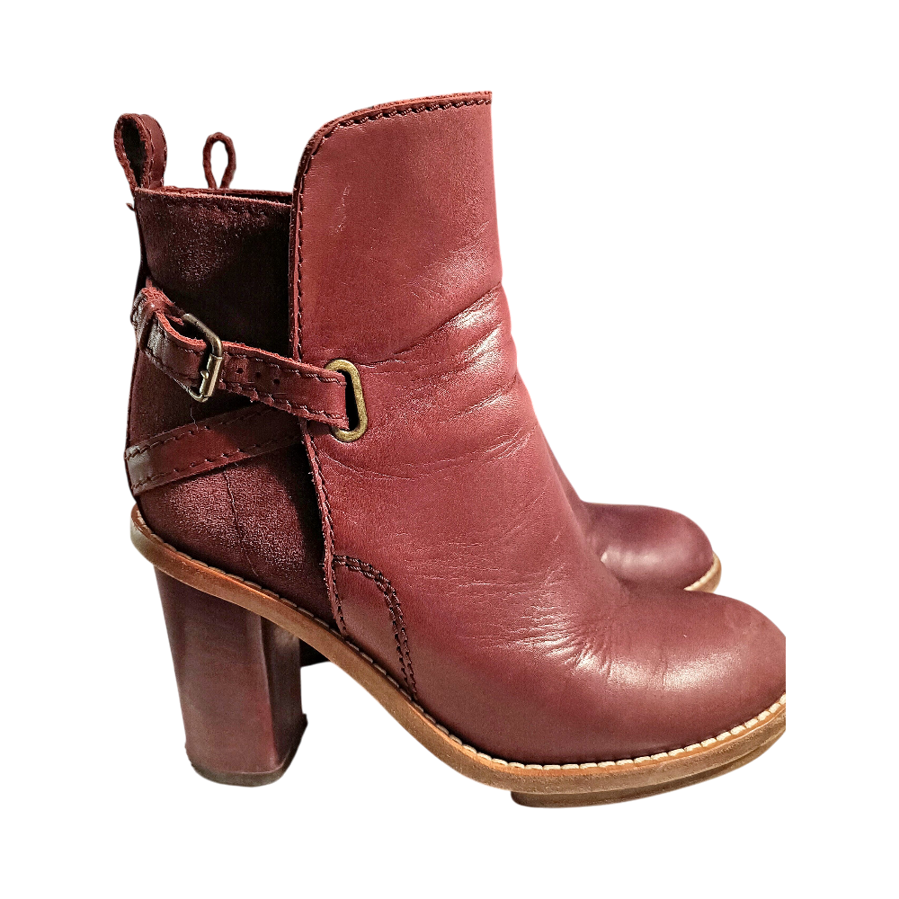 Stylish heeled ankle boots in burgundy leather.