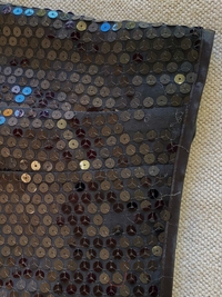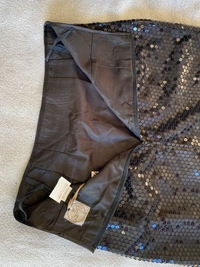 Paljettteja irronnut läheltä vyötäröä, lähikuvassa näkyy tämä kohta. Hame on roikkunut klipsullisessa henkarissa ja henkarin kohdasta sitten hajonnut. Tästä ei irtoa paljetteja!!!! (Kun hajonnut kohta korjattu ja langat päätelty, mutta nämä vauriot voi läheltä nähdä ja siksi edullinen hinta.