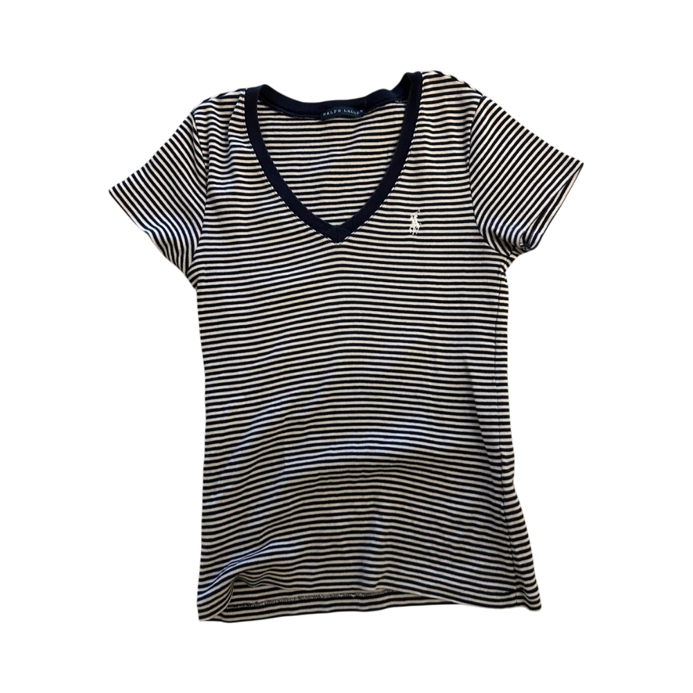 Lyhythiha, v‑aukkoinen raidallinen t‑paita, merkkilogolla. Erittäin hyvä kunto