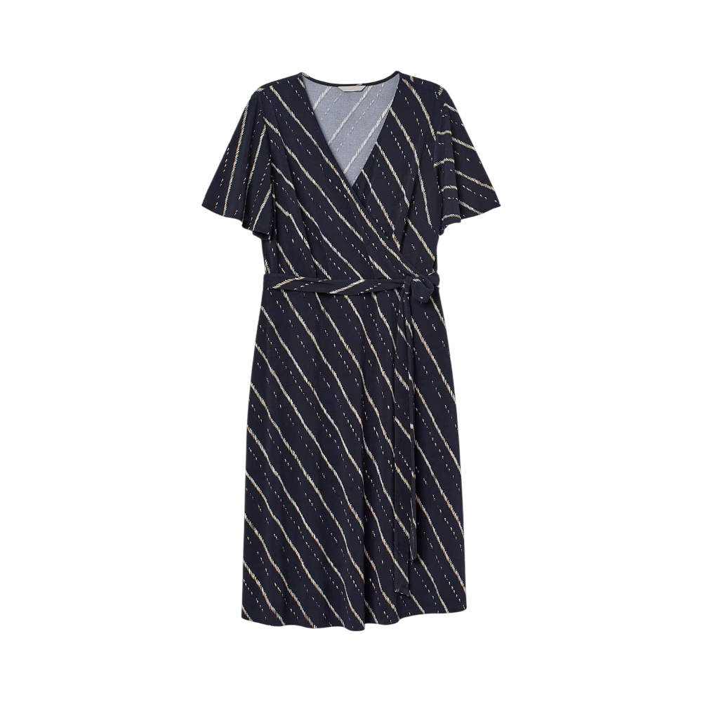 Calf-length dress in heavily draping jersey crêpe with a V-neck and wrapover top. Short, flared sleeves, a seam and detachable tie belt at the waist and a wide, circular skirt. Unlined. Fabric is not thin and not see-through.
