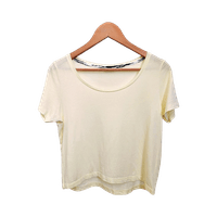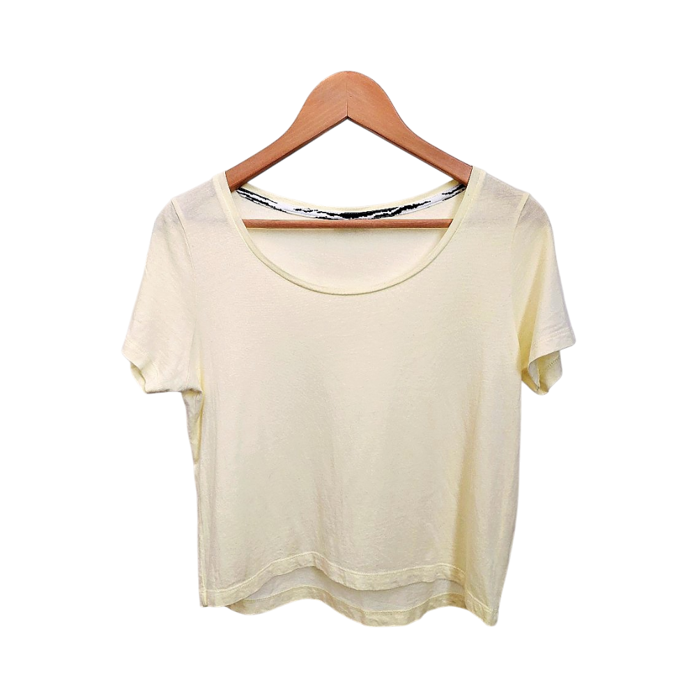 Vähän käytetty vaaleankeltainen cropped-pituinen T-paita, suuri kaula-aukko, koko S.