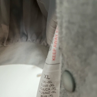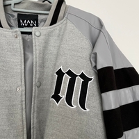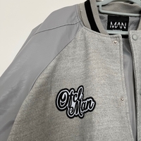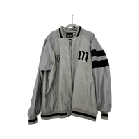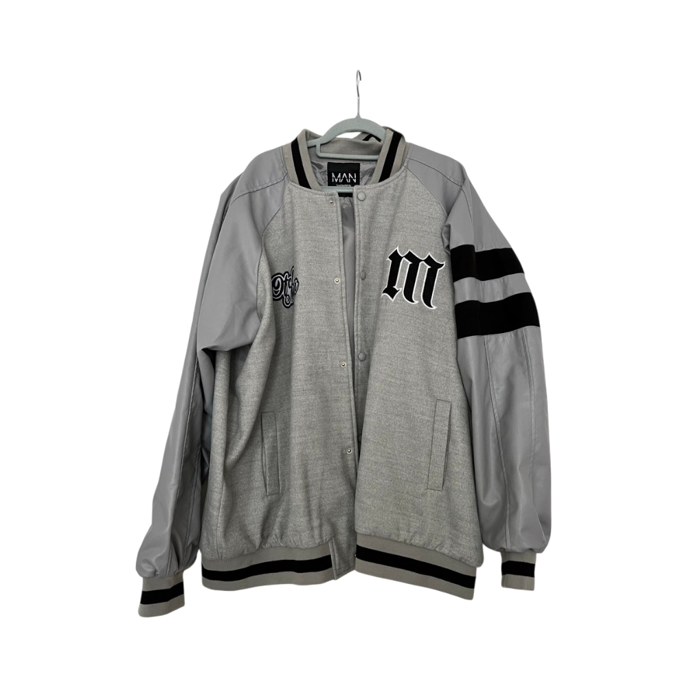 Grey varsity-style bomber jacket with patched logos, snap buttons. In a size XL.