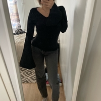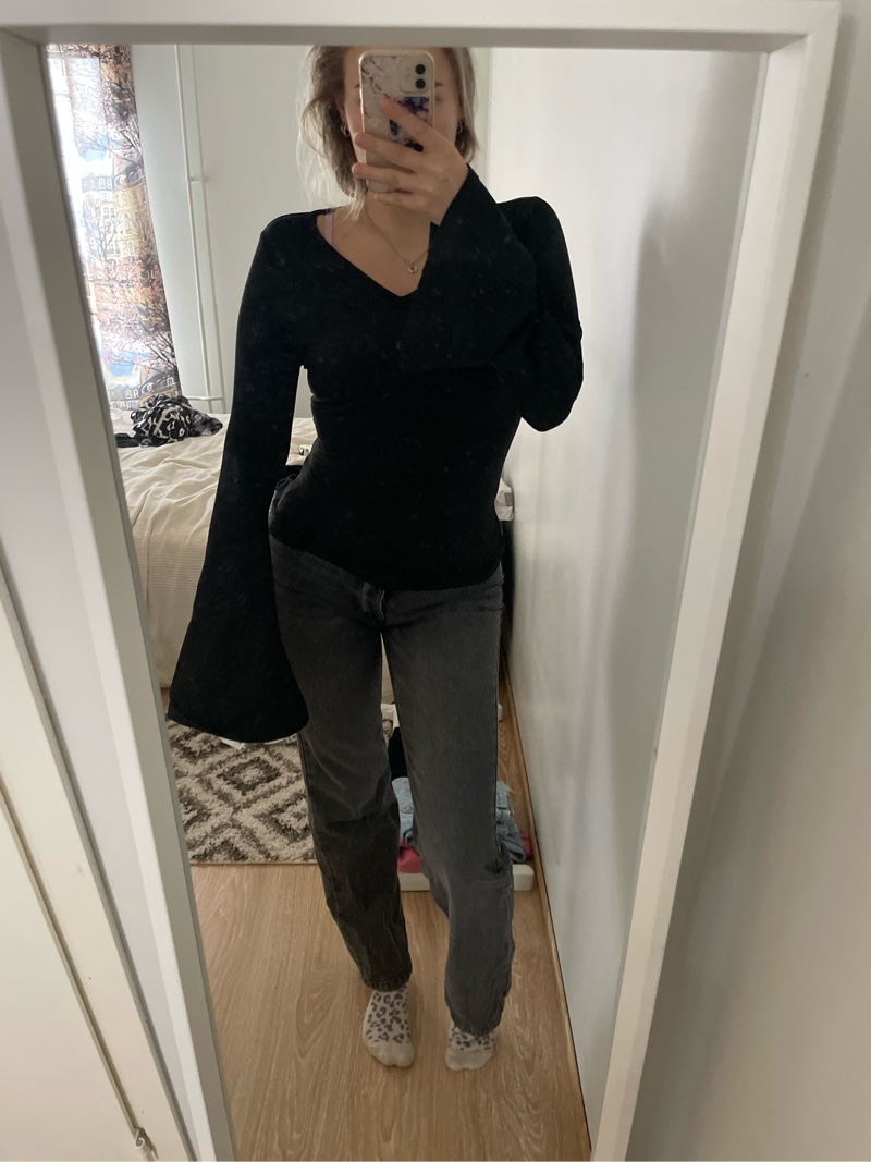 Musta pitkähihainen paita kellohihalla, V-kaula-aukko