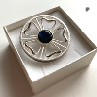 Pyöreä hopeanvärinen solki sinisellä keskikivellä.