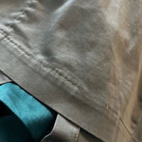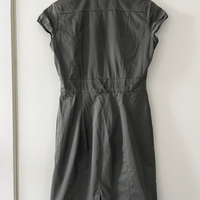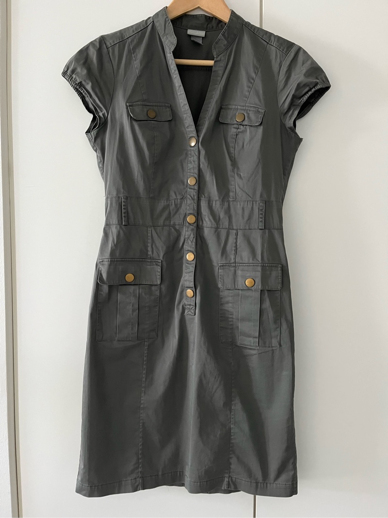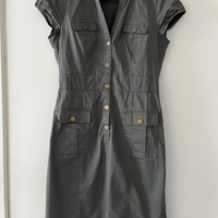 Vihertävän harmaa mekko koossa 38. Napitus ja neljä taskua edessä sekä vyölenkit. Siistissä kunnossa mutta edestä helman ommel hieman purkaantnut