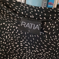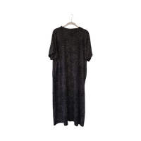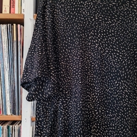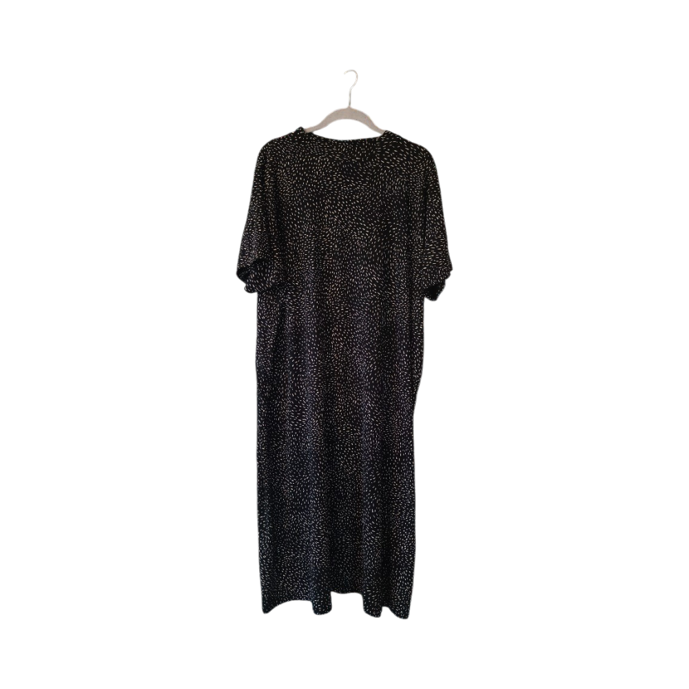 Musta midipitkä mekko hiekan värisillä pilkkukuvioilla.