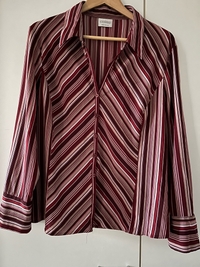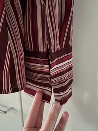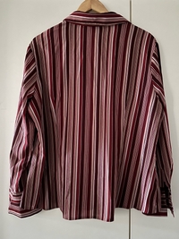 Raidallinen punerta paita. Koko merkitty 48 mutta minusta pienempi ja voi mennä monelle riippuen millaista istuvuutta kaipaa. Toisesta hihasta puuttuu nappi ja myös edestä alin, muuten hyvässä kunnossa