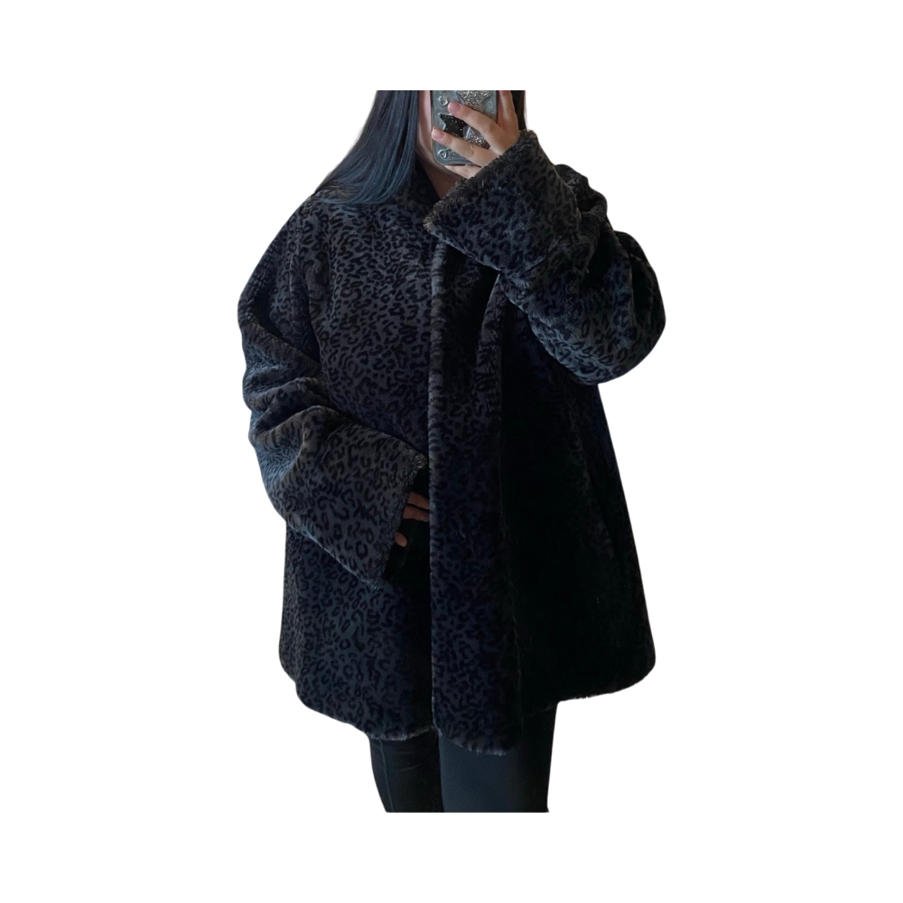 Lyhyt leopardikuosinen tekoturkistakki, pehmeä ja lämmin.