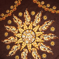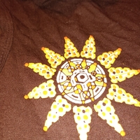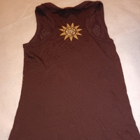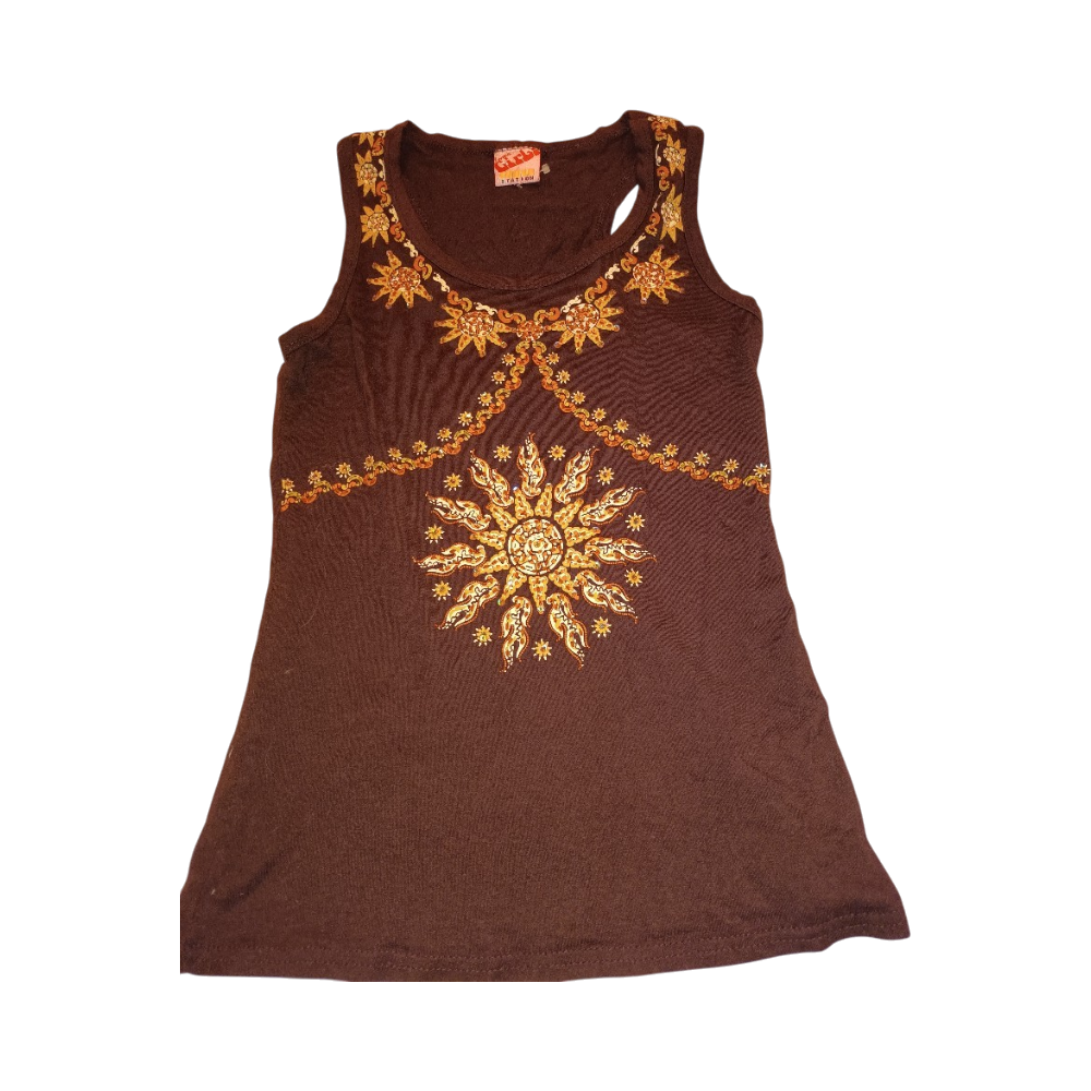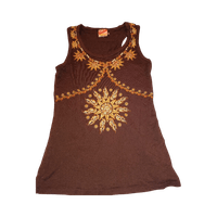 Brown sleeveless tank with yellow sun embroidery, casual fit.