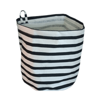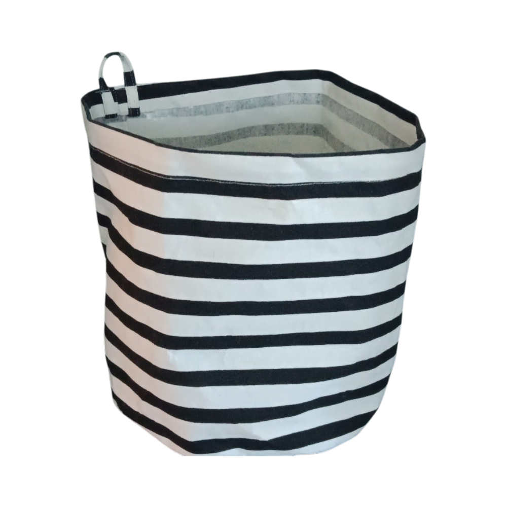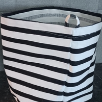 Tilava raitakori vaatteille tai leluille, kahvalla. Korkeus 28cm,halk. 25 cm. Muovilla päällystetty sisusta ,helppo puhdistaa.