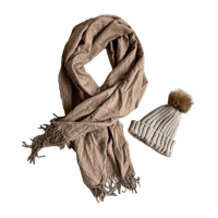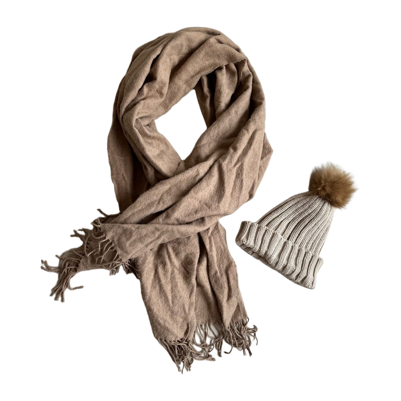 Beige kaulahuivi ja pipo. Käytetty muutaman kerran. Hyvässä ja ehjässä kunnossa