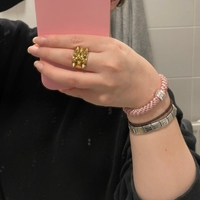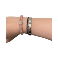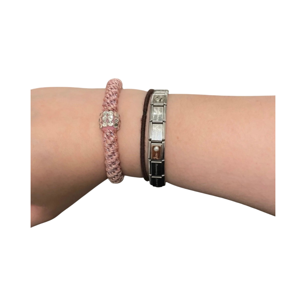 Vaaleanpunainen punottu rannekoru, keskellä strassipala.