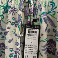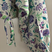 Valkoinen pusero violetilla ja vihreällä kukkakuosilla.