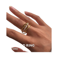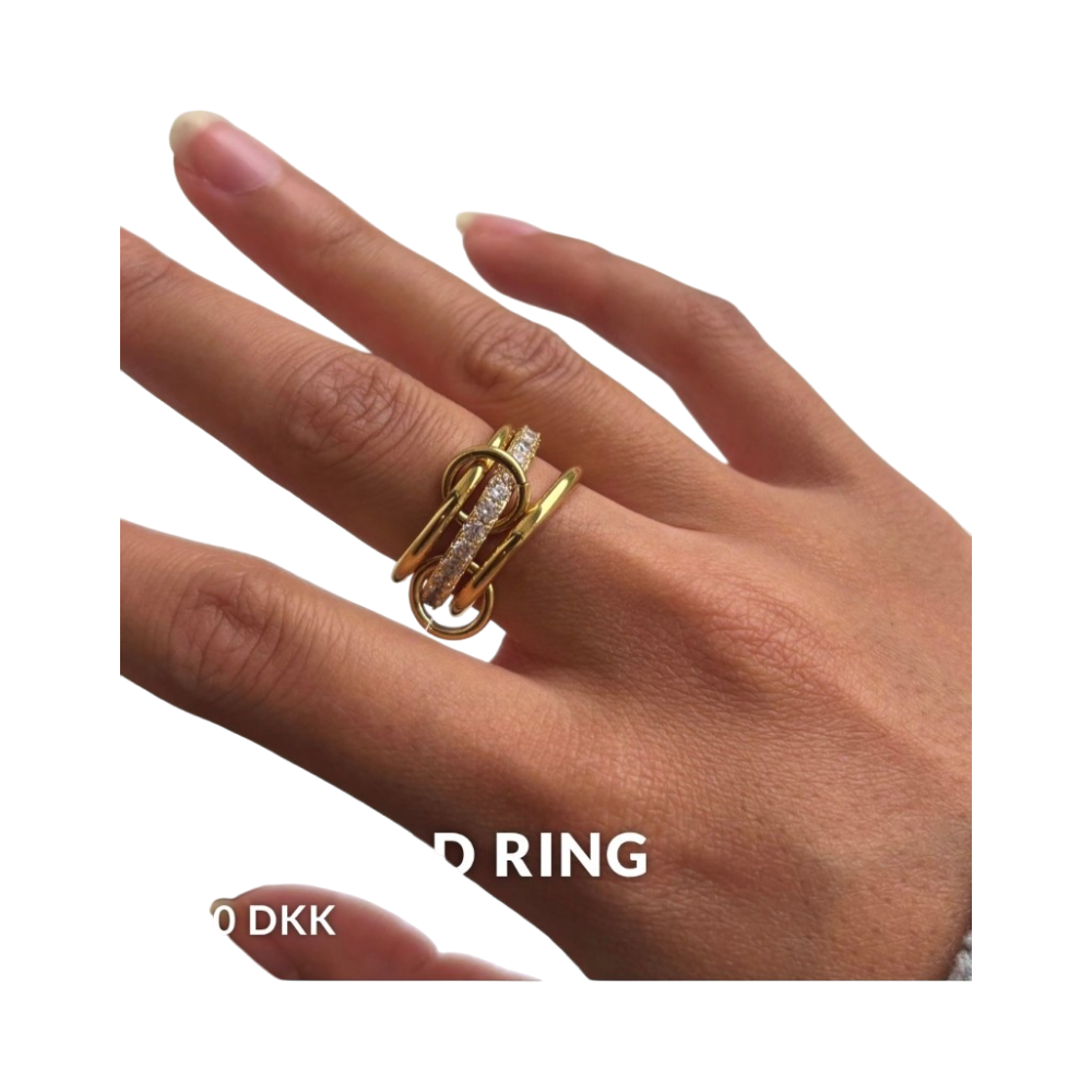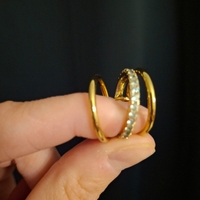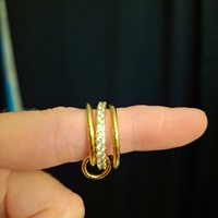 Kolme yhdistettyä kultasävyistä sormusta, yksi kivillä koristeltu. Itselle mahtuu pikkurilliin, en tiedä tarkkaa kokoa, varmaa. 15 tai 16