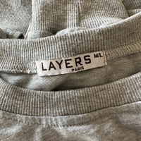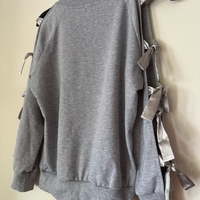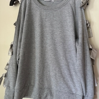 Harmaa naisten pusero hopeanvärisillä nauhoilla sivuilla. Koko M/L, vastaa enemmän kokoa M. Materiaali ei tiedossa.