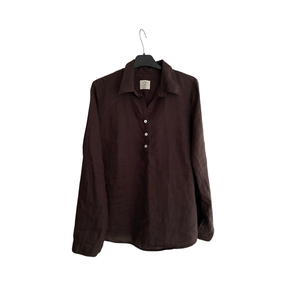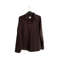 Long-sleeve brown linen shirt with partial button placket.