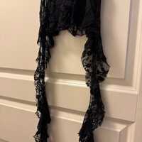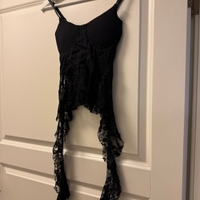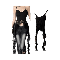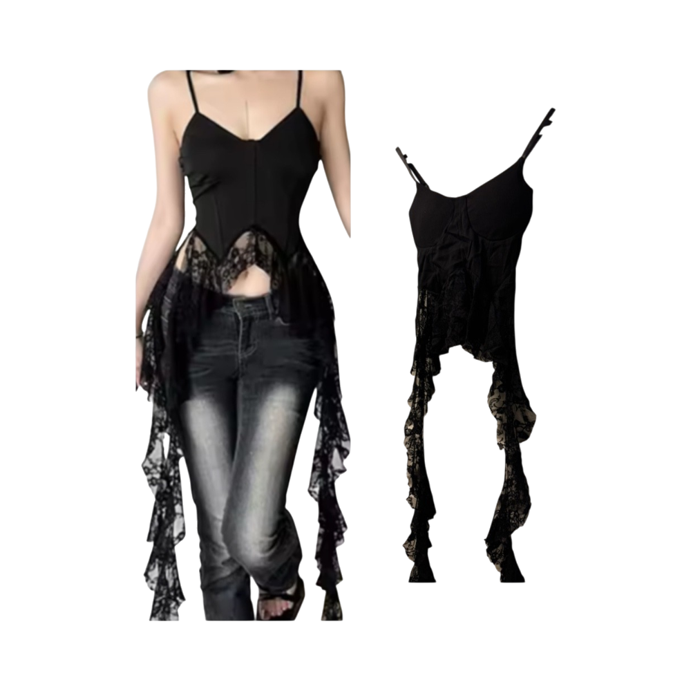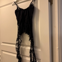 Lyhyt toppi ohuilla säädettävillä olkaimilla ja pitkillä pitsitaskuilla.