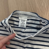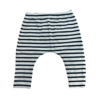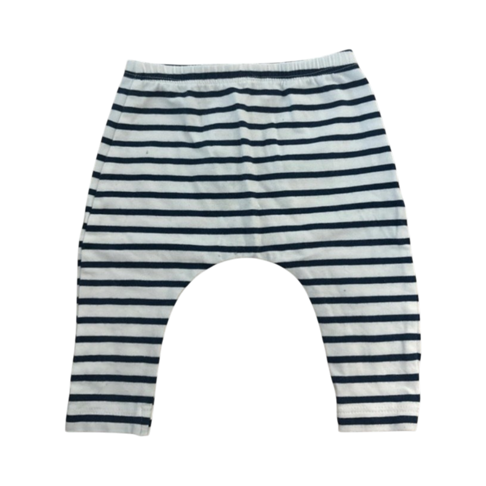 Valkoiset ja tummansiniset raidalliset vauvan housut, joustava vyötärö.