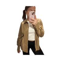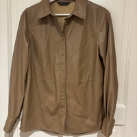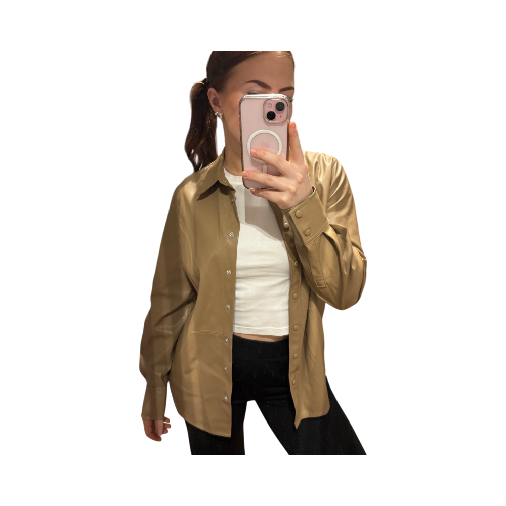 Beige/konjakin sävyinen nappikauluspaita, keinonahkaa muistuttava.
