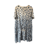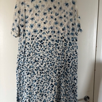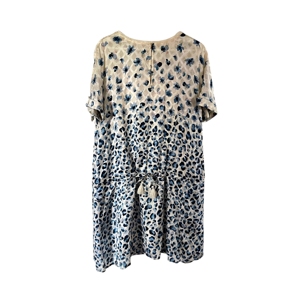 Luonnonvalkoinen, polvipituinen silkkimekko sinisillä kuvioilla. 100% silkkiä. Alaosassa kiristysnauhat. Mekon mukana tulee irrallinen alusmekko.