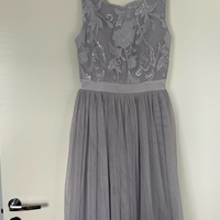 Vaaleanharmaa, lilaan taittava juhlamekko upeilla paljettikirjailulla. Tyllihelma. Käynyt yhdet juhlat. Olka-helma pituus 100 cm. Koko n. 42, selkämys joustaa.