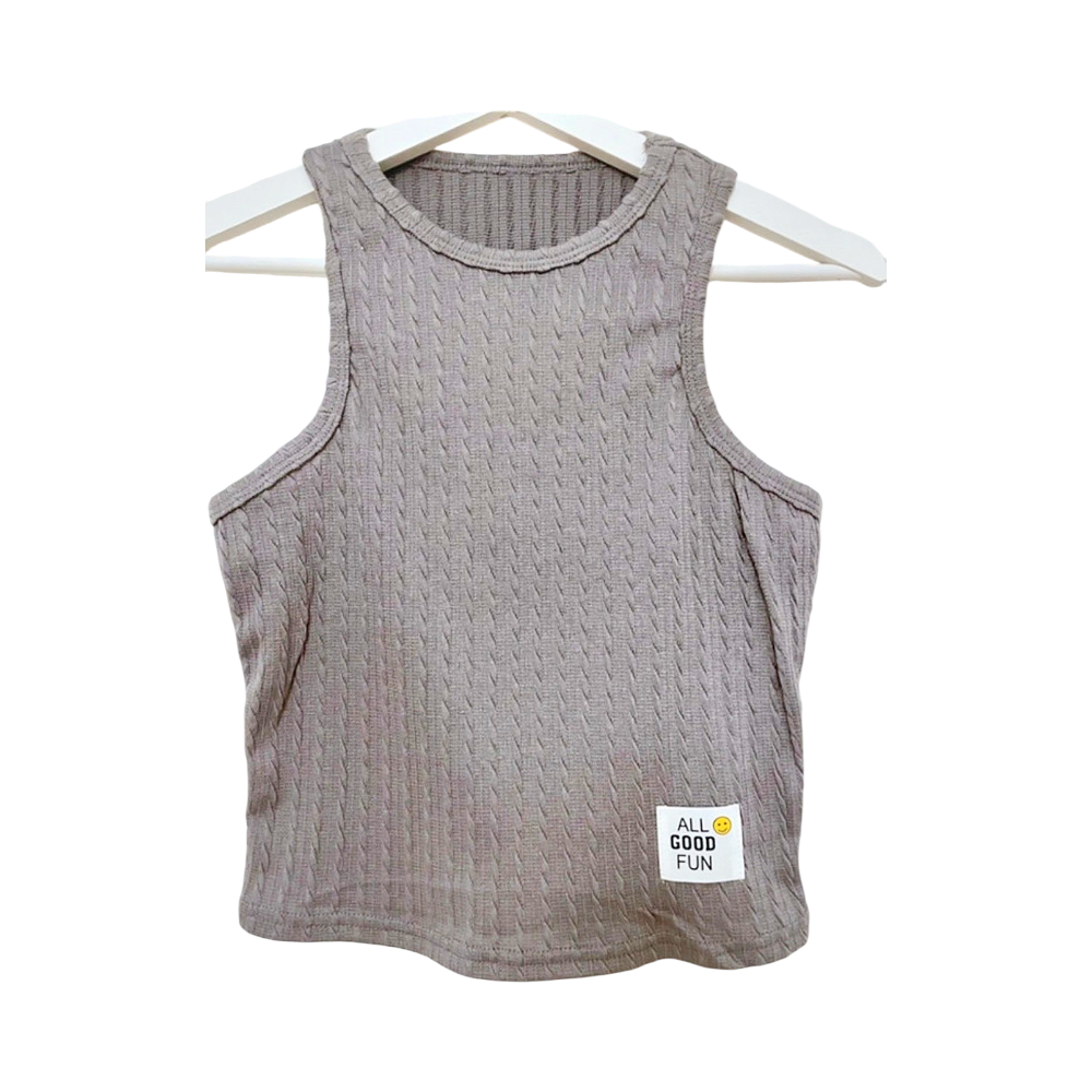 Trendy grey ribbed sleeveless crop top with a “All good fun” patch. Size XS/S, brand new and never worn. Soft and stretchy fabric makes it perfect for everyday wear, casual outfits, or summer street looks. Easy to pair with jeans, skirts, or joggers – a must-have piece for your wardrobe!