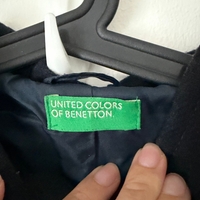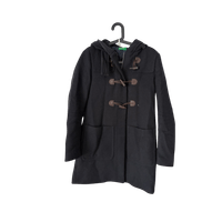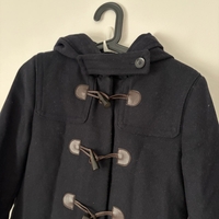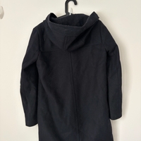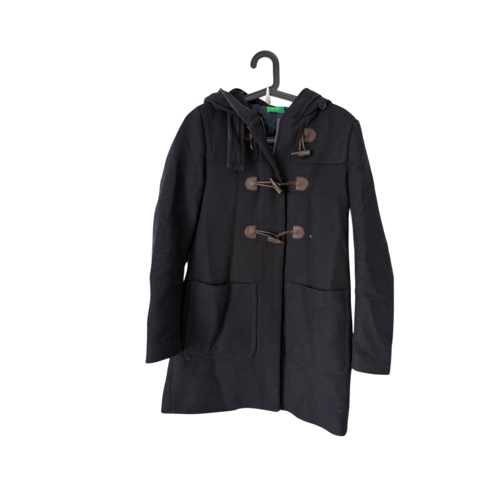 Tummansininen villakangastakki huppulla ja puuhelmoilla, käytetty mutta hyväkuntoinen.