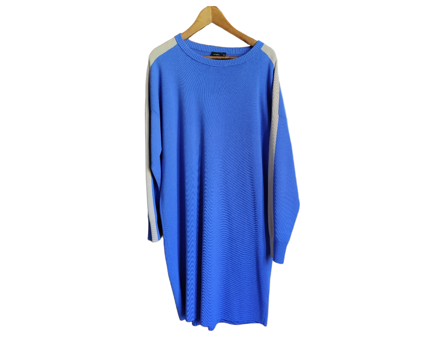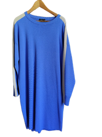 Pitkä vaaleansininen neulemekko beigen raidoilla hihoissa. Muutaman kerran pidetty, joustava materiaali, väljyyttä löytyy. Kainalo - kainalo 62 cm, pituus 100 cm viskoosi 72 %, polyamidi 28 %. Koodilla MN2831 ilmainen toimitus.