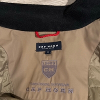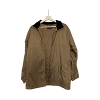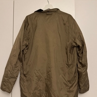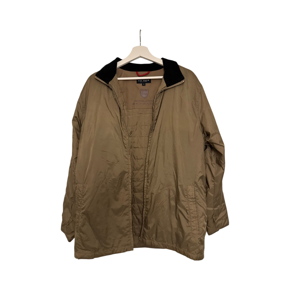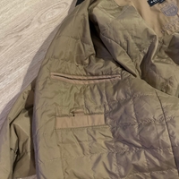 Kevyt khakinvärinen välikausitakki, musta kaulus.
