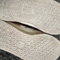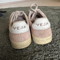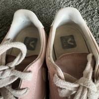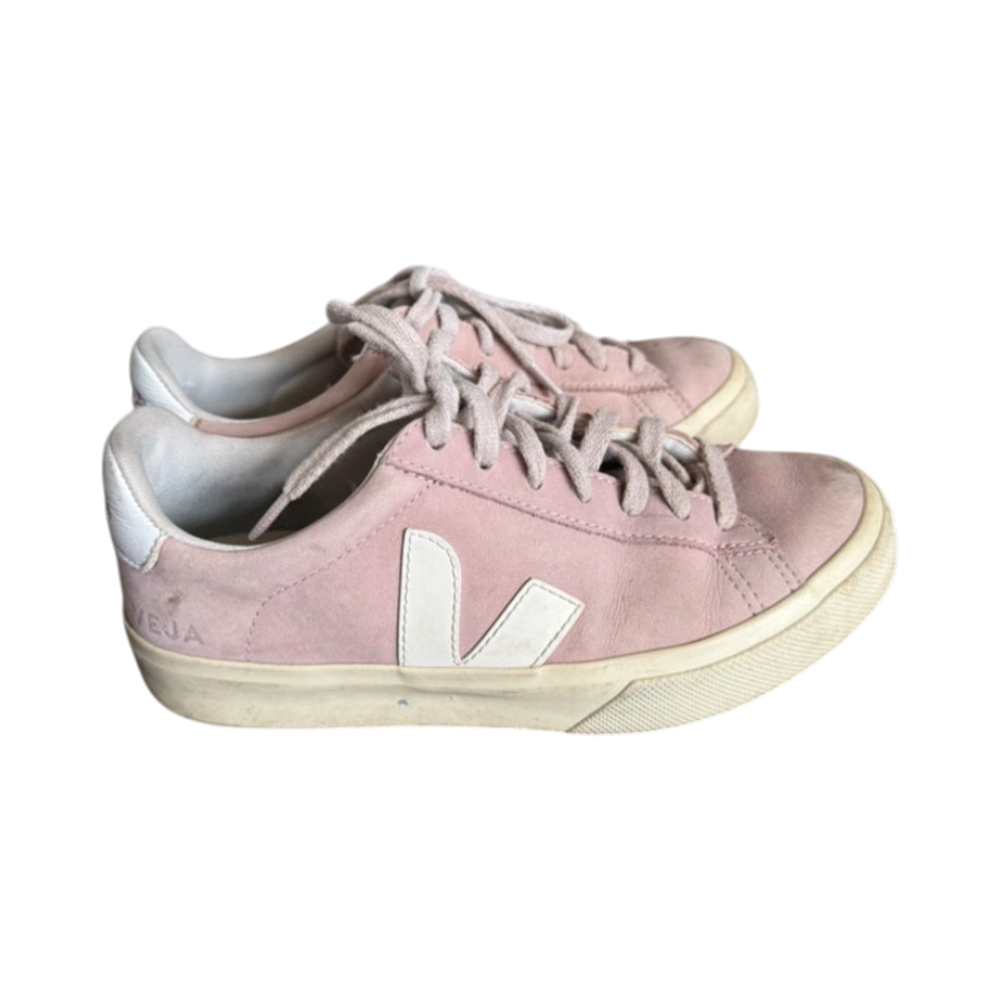 Lightly worn pink suede sneakers with white logo and rubber sole.