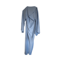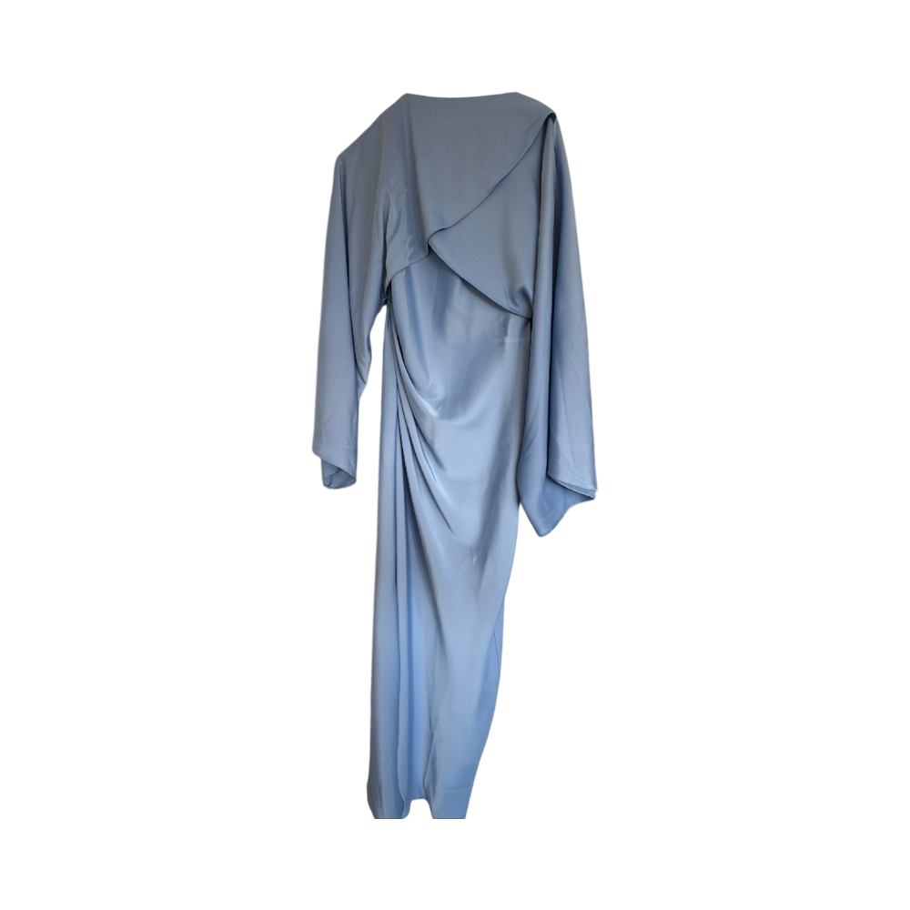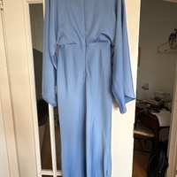 Pitkä juhlamekko, liehuvat hihat ja draperaus selässä.