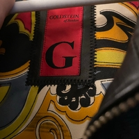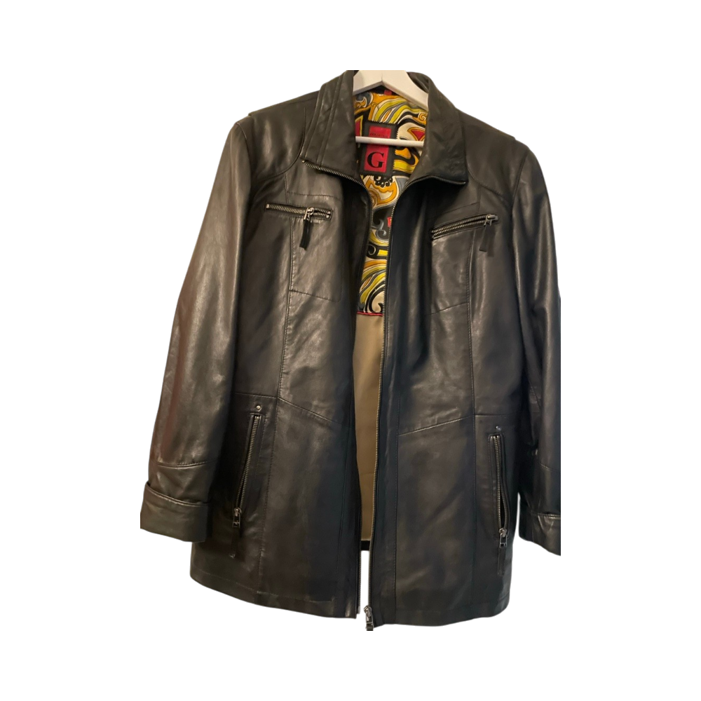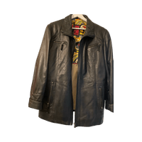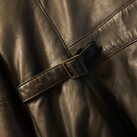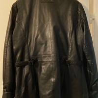 Musta nahkatakki, vyö ja kuvioitu vuori, hyväkuntoinen.