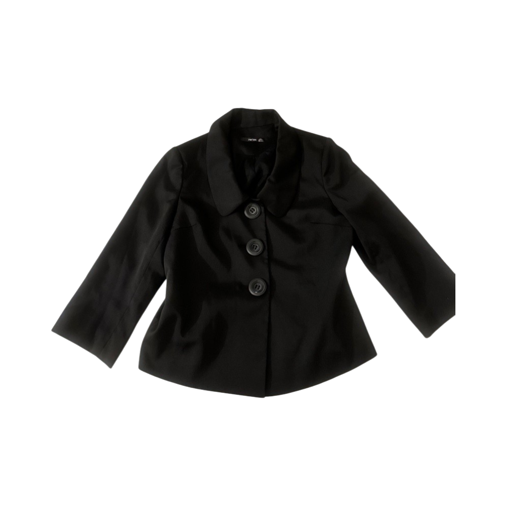 Lyhyt musta napitettava naisten jakku, tyylikäs ja siisti.