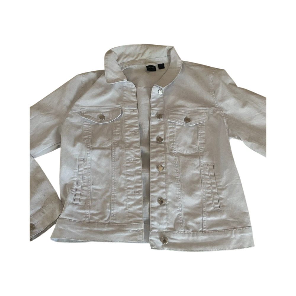 Valkoinen naisten farkkutakki, napit edessä, klassinen malli.