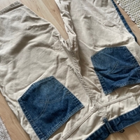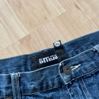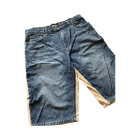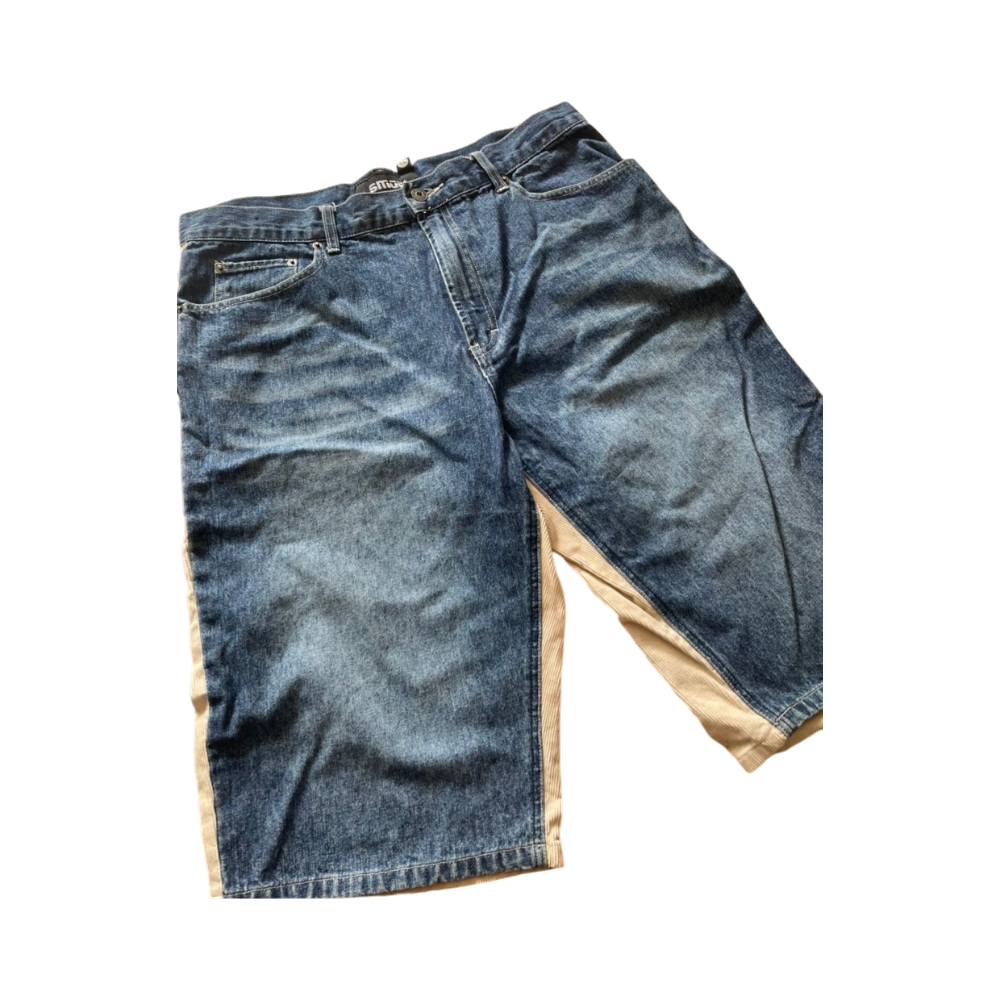 Sinivalkoiset farkkusortsit, leveät lahkeet, koristeellinen takaosa