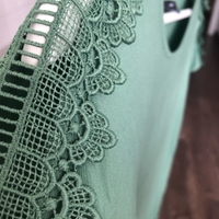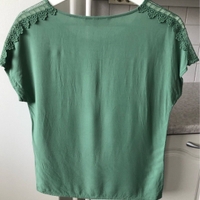 Vero Modan vihreä t-paita, jossa olkapäissä pitsikuviot. Malliltaan melko lyhyt. Kangas vaatii silittämistä. Käyttämätön, mutta pesty kerran.