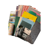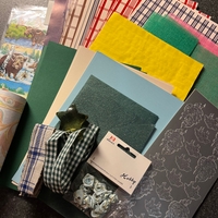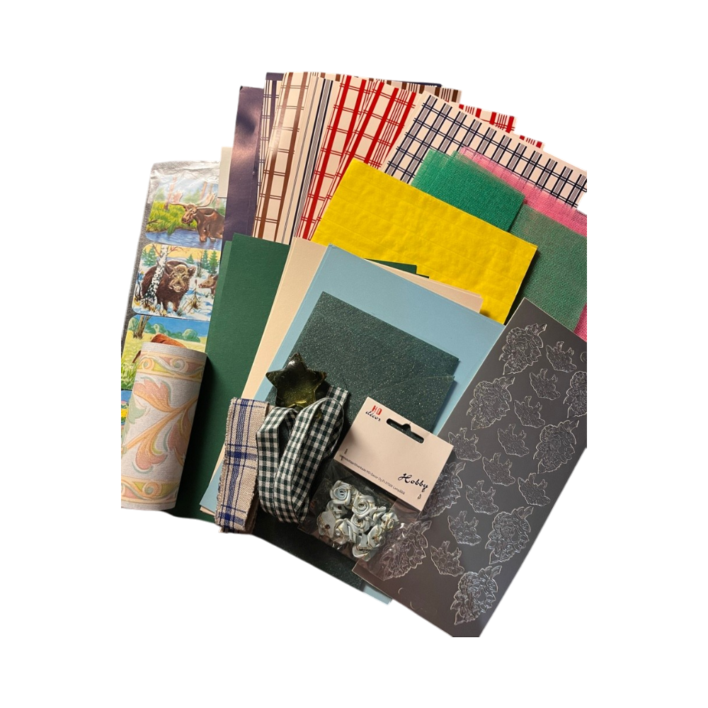 Sekoitus koristepapereita, nauhoja ja muuta sekalaista askarteluun