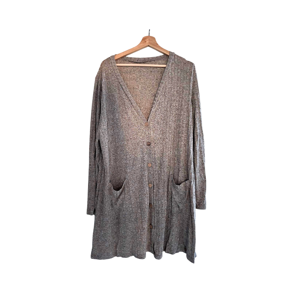 Uusi ruskea neulecardigan. Pitkähihainen malli, nappikiinnitys ja taskut sivuilla.
