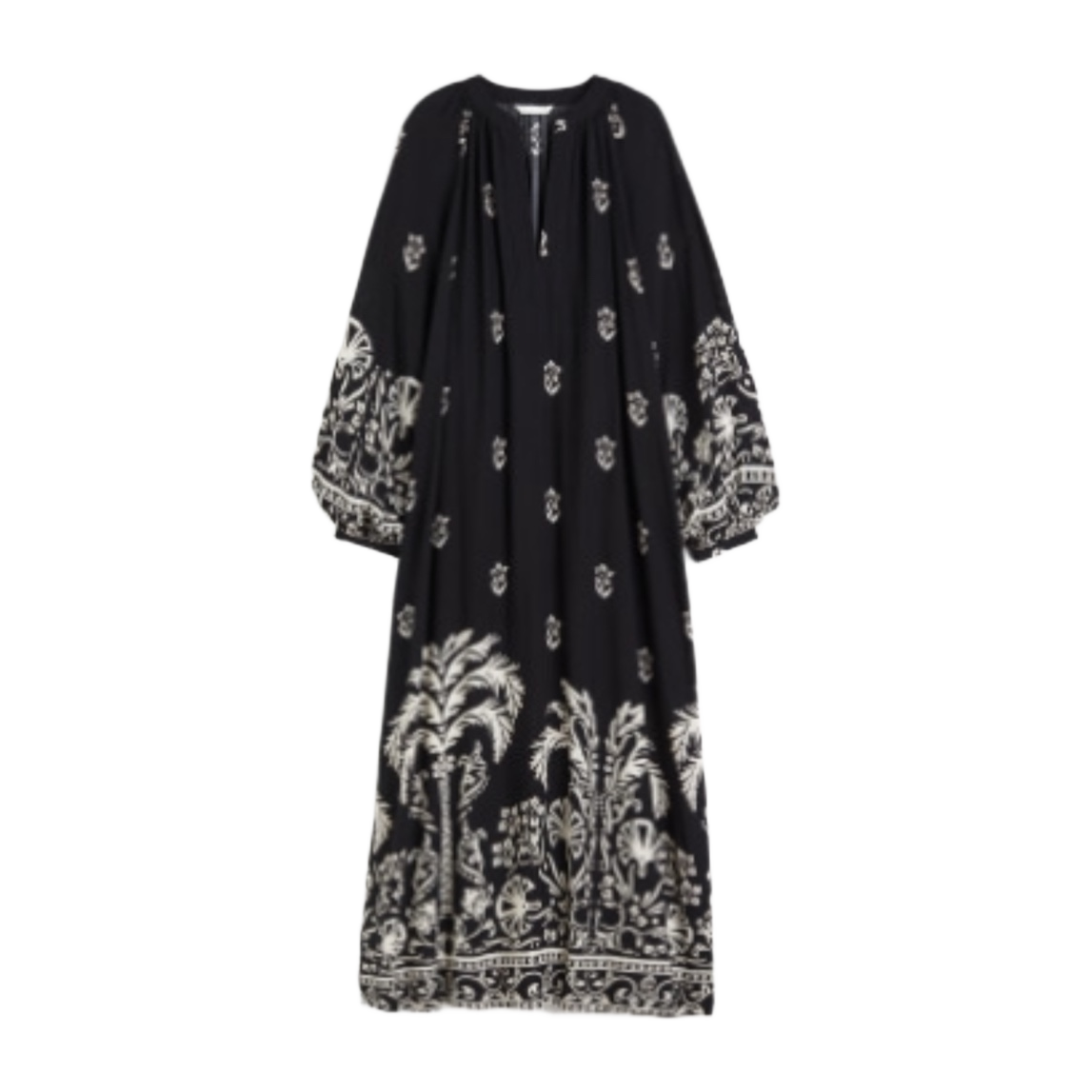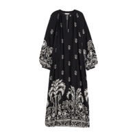 H&M nilkkapituinen maximekko, koko S. Mekko on malliltaan väljä ja istuu erinomaisesti myös M-kokoiselle. Pitkät, pussimaiset hihat. Helman sivuissa halkiot, halkioiden korkeus on 41 cm. Mekon pohjaväri on musta, kuviot ovat kermanvaaleat. Materiaali on kauniisti laskeutuvaa ja ihoa vasten todella miellyttävää, 100% viskoosia. Erittäin hyväkuntoinen.