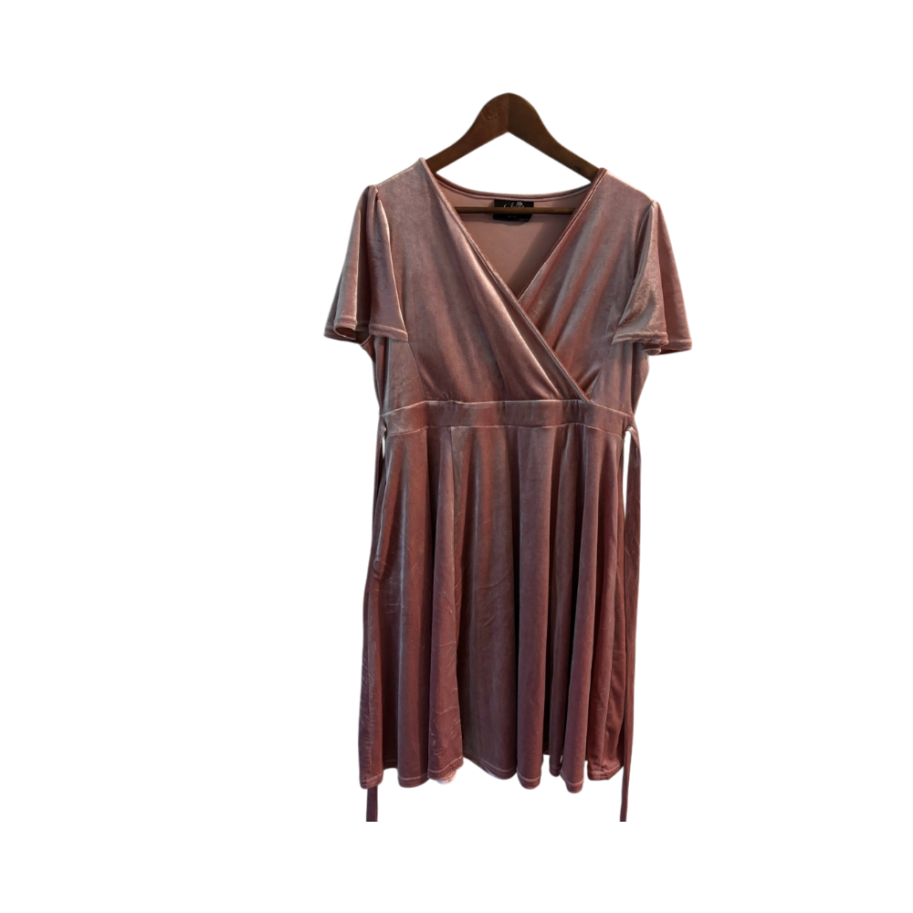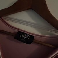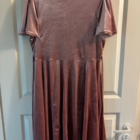 V-pääntie, lyhythihainen velourmekko vyöllä. Saumassa pieni jälki ( ks. kuva, ei haittaa käyttöä)
