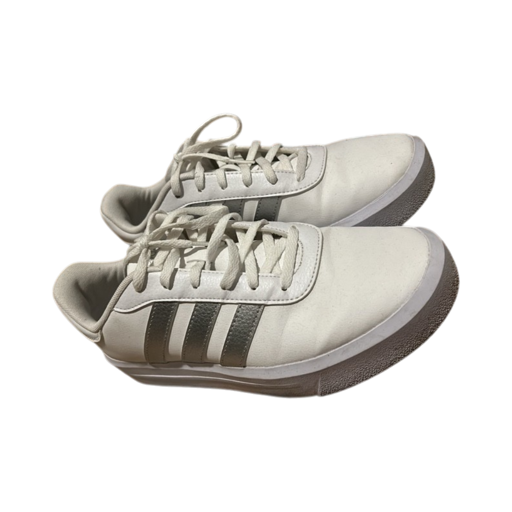 Valkoiset matalat tennarit, hopeiset kolmiraidat, erittäin hyväkuntoiset.