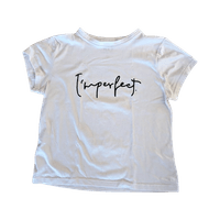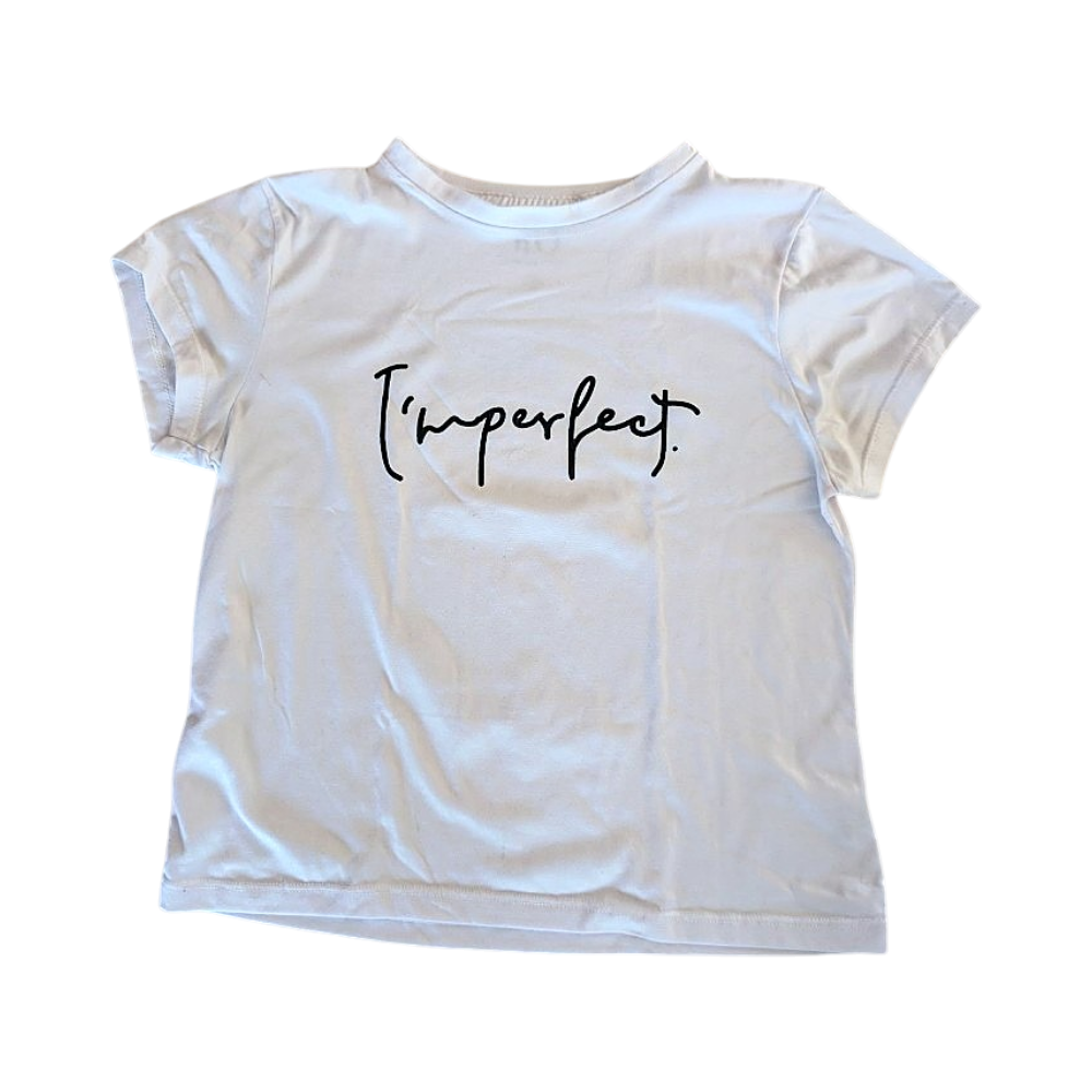 White t-shirt with black 'Imperfect' print, short sleeves.