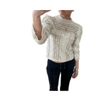 Textured lace long-sleeve blouse with high neck and ruffles.