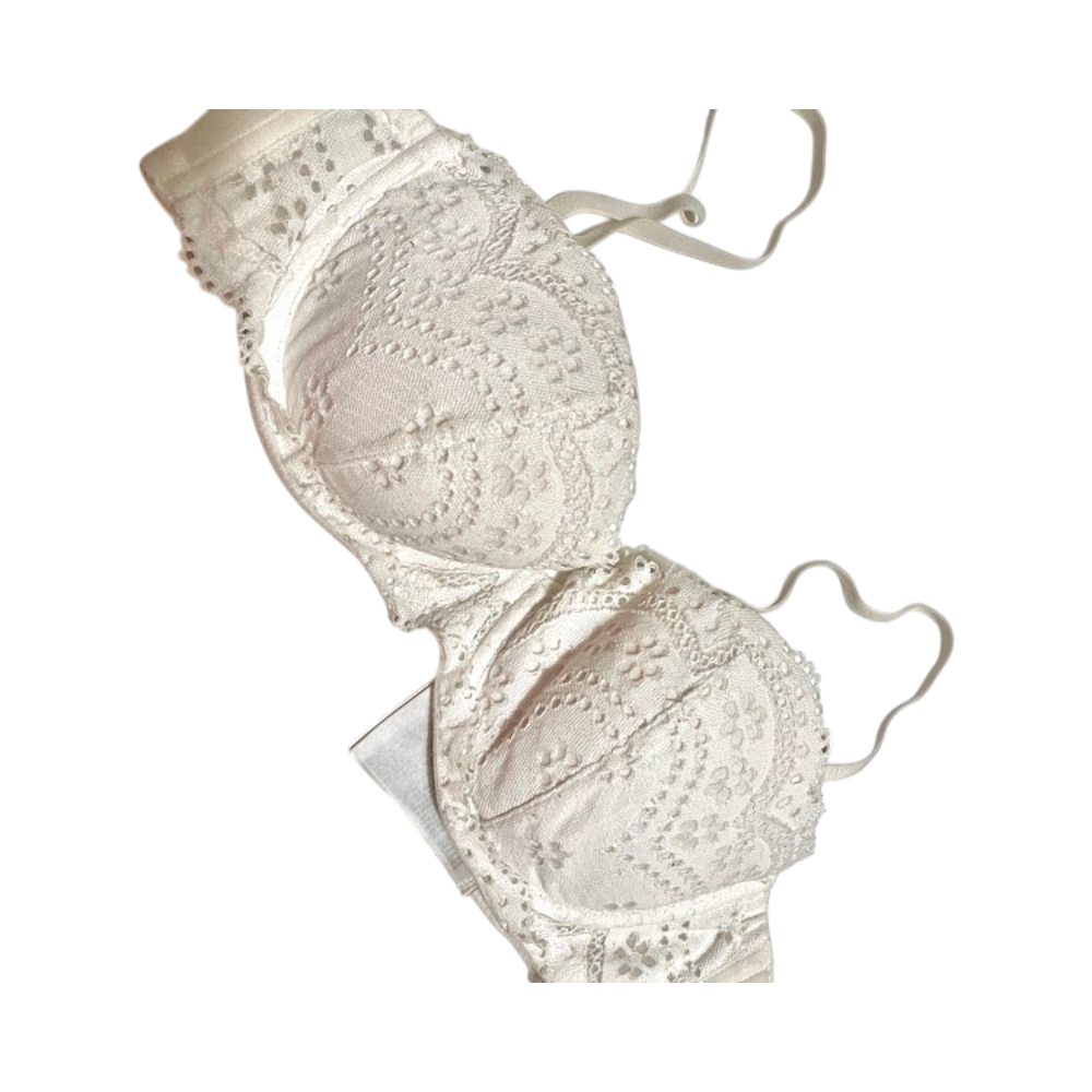 Valkoiset kaarituelliset pitsirintaliivit, koristeellinen kuviointi.