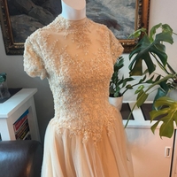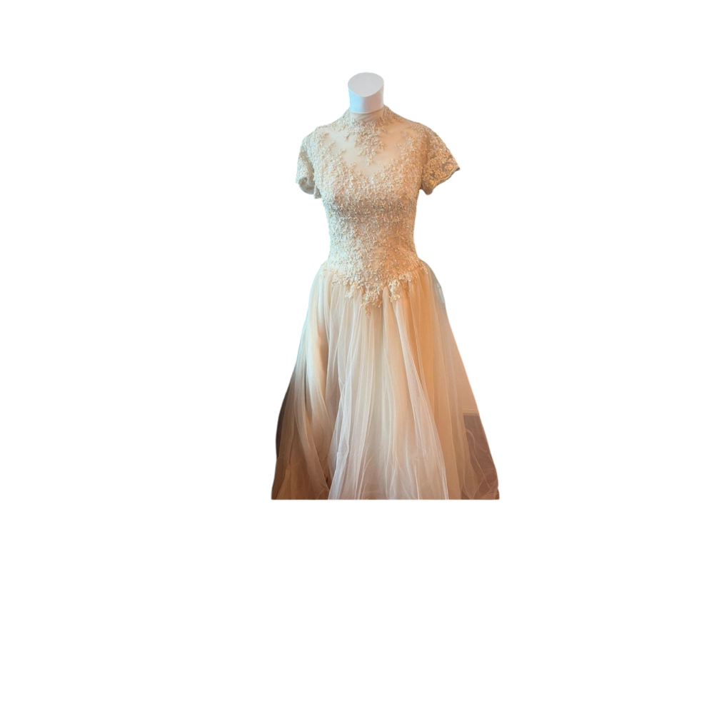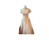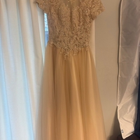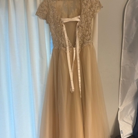 Beige/light rose tulle gown with embroidered lace bodice and lace up back. I am 159 cm tall.