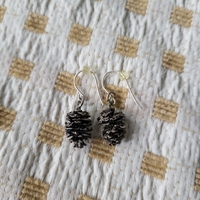 Korvakorut, joissa on hopeanväriset käpyriipukset ja koukkukiinnitys. Vanhat, mutta hyvässä kunnossa.