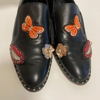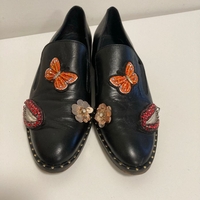 High-quality genuine leather shoes handmade in Spain, featuring unique embellishments: beaded butterflies, floral appliqués and sparkling lip motifs. Metal stud detailing around the sole and durable leather outsole. Soft leather, comfortable fit.