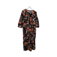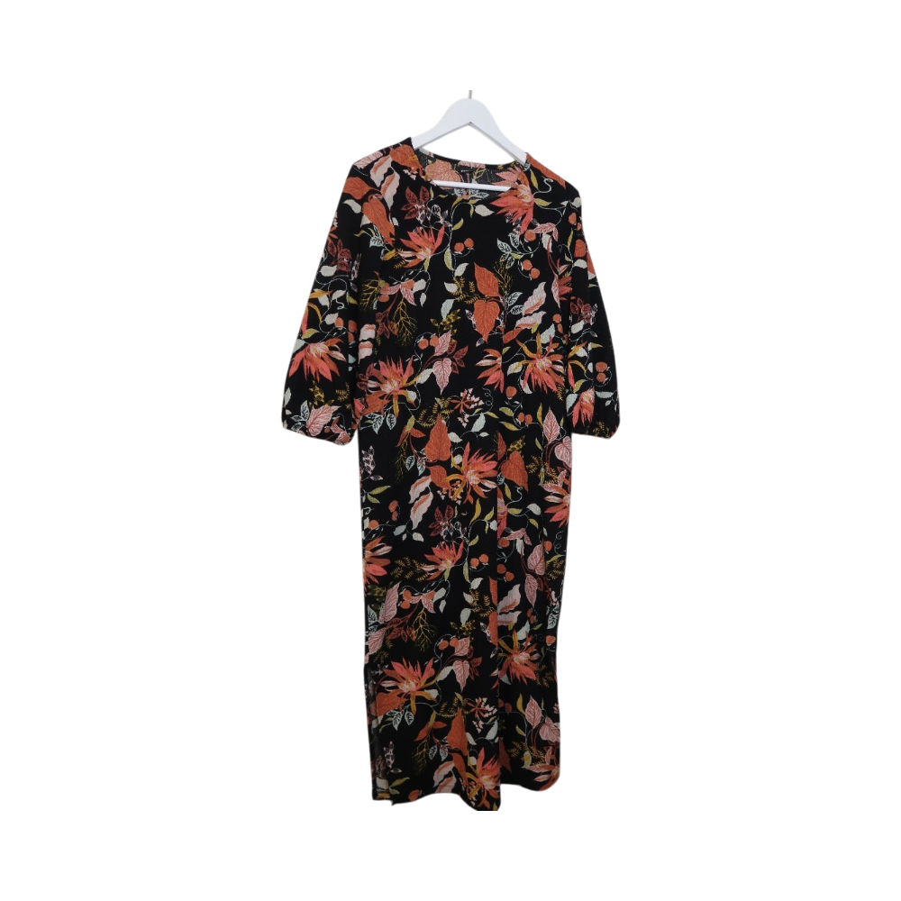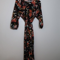 Musta kukkakuvioitu pitkä mekko, vyö mukana ja vyölle löytyy lenksut. koko M.