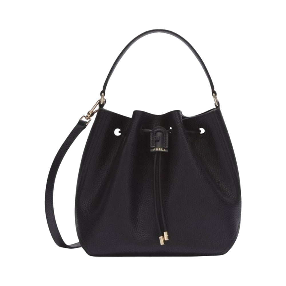 Uusi Furla Atena Keria bucket bag, väri musta. Mitat näkyy kuvissa.