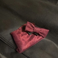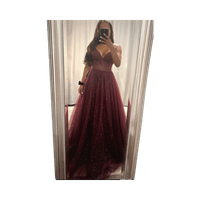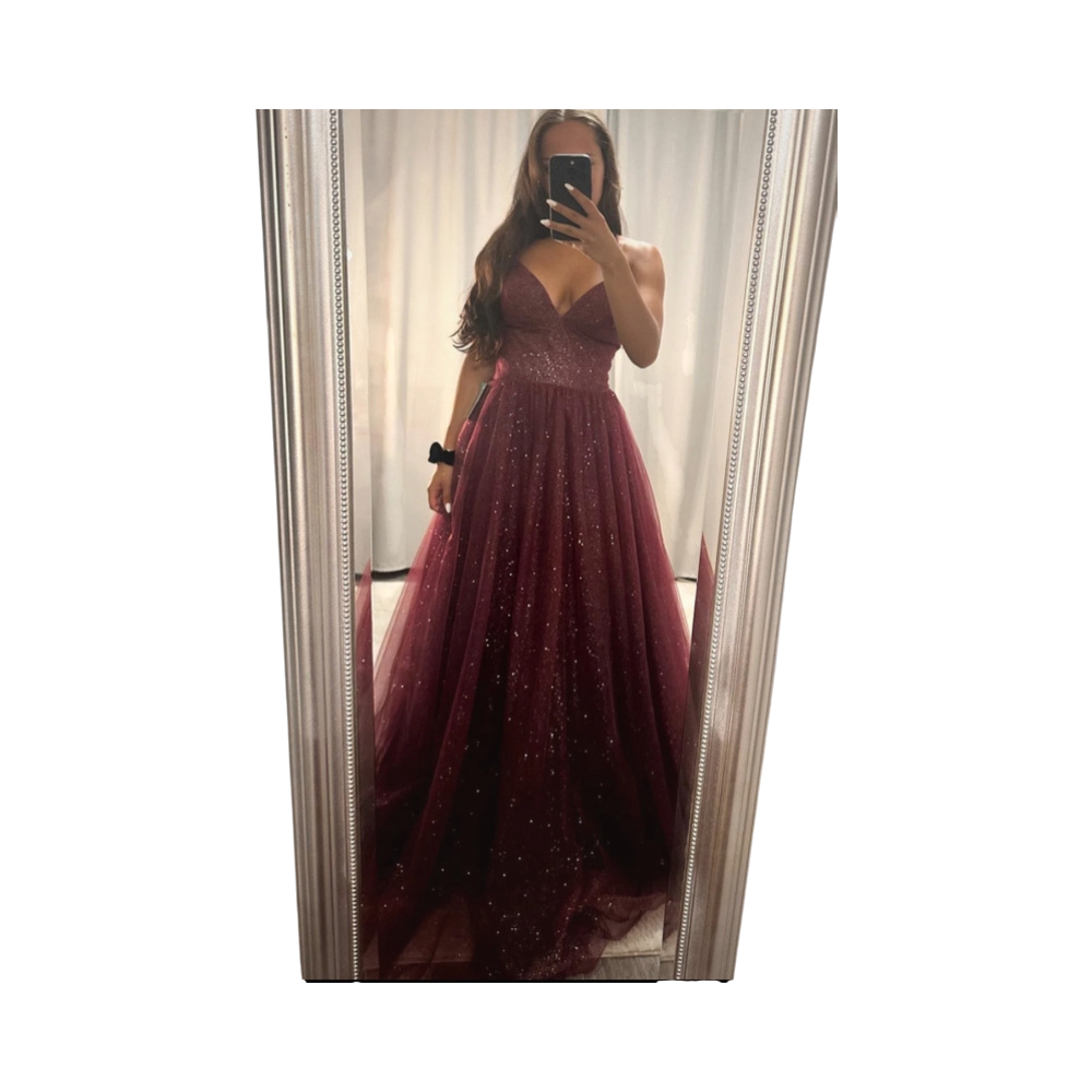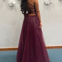 Pitkä glittersatiininen juhlapuku, avonainen ja nauhallinen selkäosa. Mukana myös parille taskukangas ja rusetti.